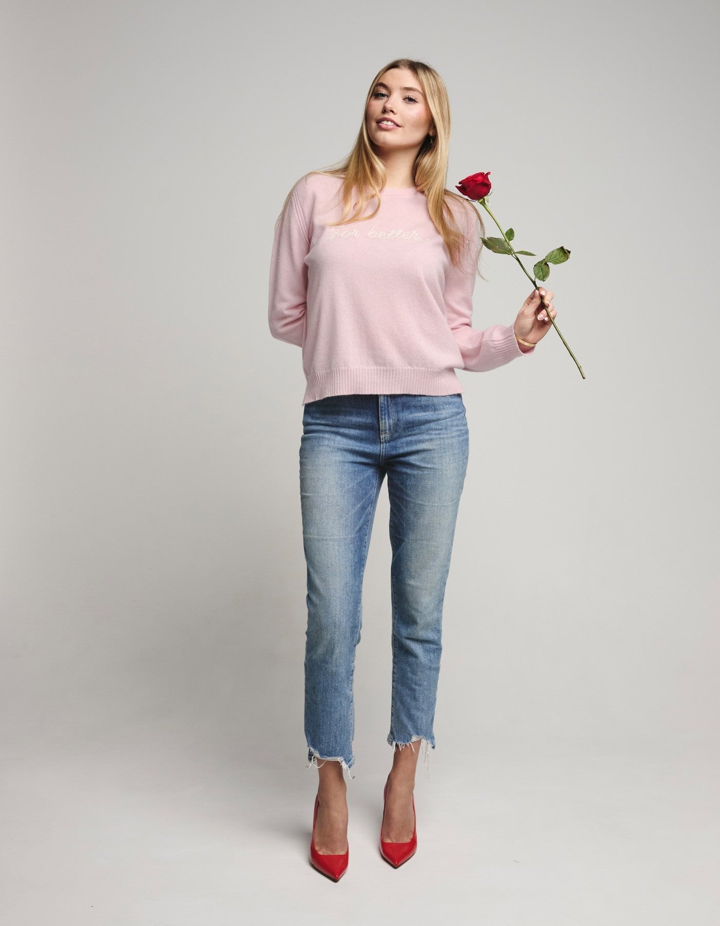 Our For Better, For Worse sweater is part of the limited edition Valentine's Edit, a soft pink statement knit with a playful twist. Featuring “For better” embroidered in cream chain stitch across the front, and “for worse” cheekily stitched in bold red on the back, it's a tongue-in-chic take on romance or simply when you have left a late lunch slightly "worse" than when you arried.. the interpretation is yours ..